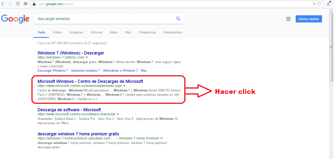 El primer paso para poder descargar Windows en nuestro ordenador será realizar una pequeña búsqueda. Deberemos ingresar a nuestro navegador favorito y escribir en la barra de búsqueda ‘Descargar Windows’. Seguidamente, sólo tendrás que presionar la tecla ‘Enter’.
