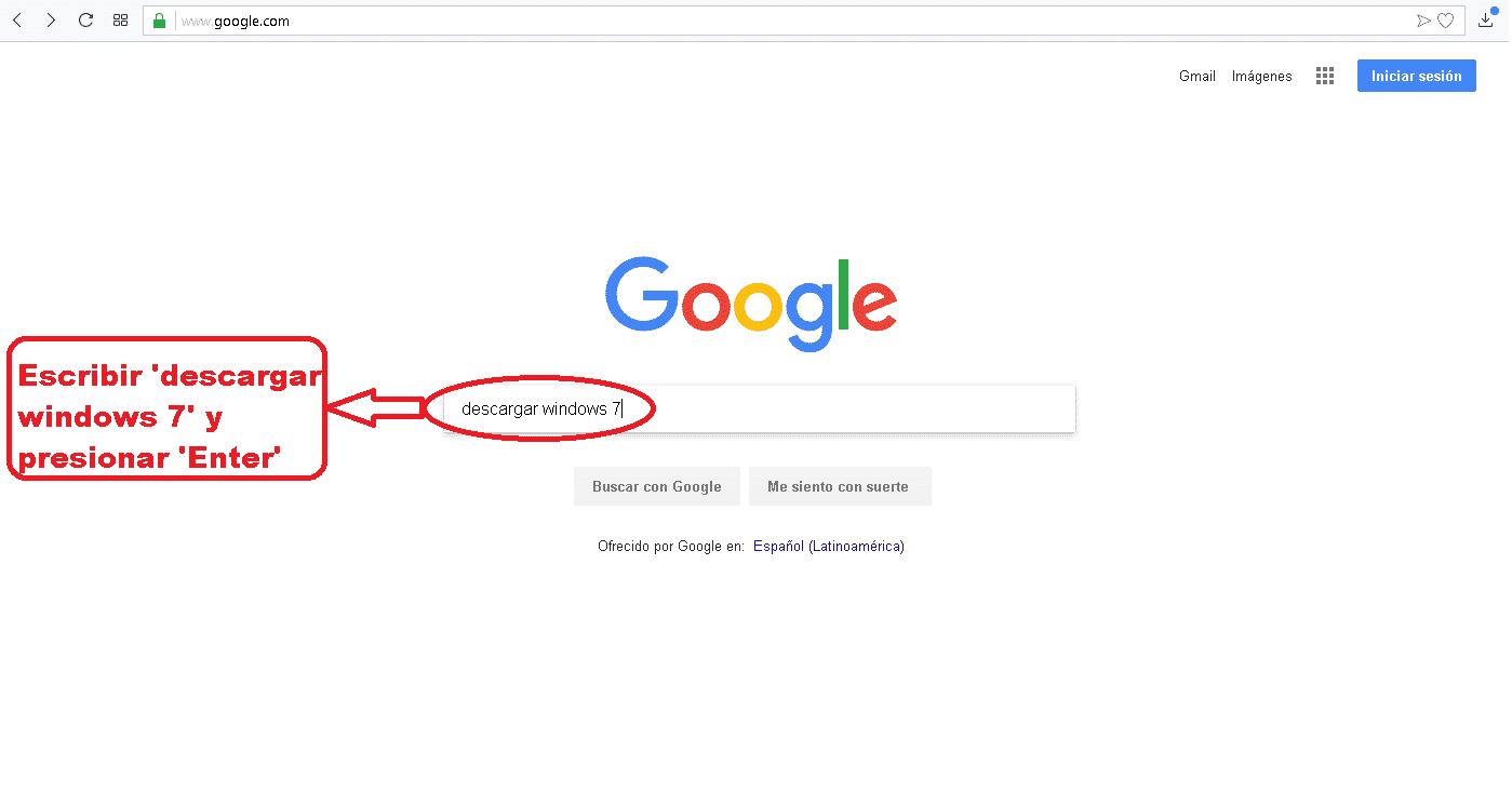 El primer paso para poder descargar Windows 7 gratis a nuestro ordenador es ingresar al navegador. Seguidamente, podrás escribir en la barra de búsqueda de Google ‘Descargar windows 7’ y presionar la tecla ‘Enter’.