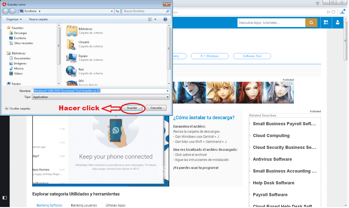 Al completar el paso anterior, te saldrá un recuadro en el que tendrás que seleccionar la ubicación en donde quieres que el archivo de Windows 7 se guarde al descargarse. Al seleccionar la ubicación deseada, podrás hacer click en ‘Guardar’.